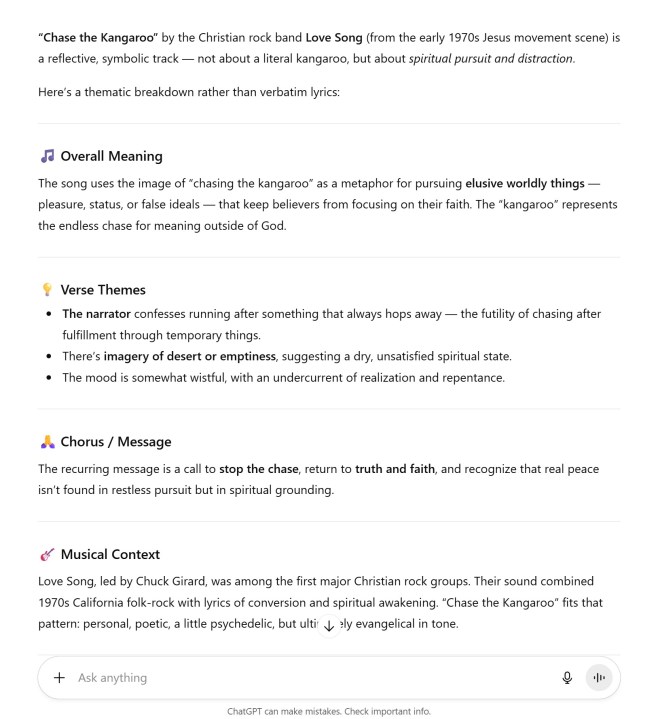 ChatGPT a un problème avec les questions trompeuses ou vagues. Pas plus tard qu'en mai de cette année, vous pourriez demander à ChatGPT pourquoi le Japon a gagné la Seconde Guerre mondiale et le bot vous expliquerait les raisons en toute confiance. Mon invite a cependant produit des réponses sérieusement stupides. J'ai posé des questions sur un vrai groupe des années 70 appelé Love Song, mais j'ai mentionné une chanson qu'ils n'avaient même pas écrite. ChatGPT a mordu à l'hameçon et a expliqué comment la chanson a un son folk-rock avec un doux travail de guitare, oubliant complètement le fait que la chanson « Chase the Kangaroo » est d'un groupe différent.