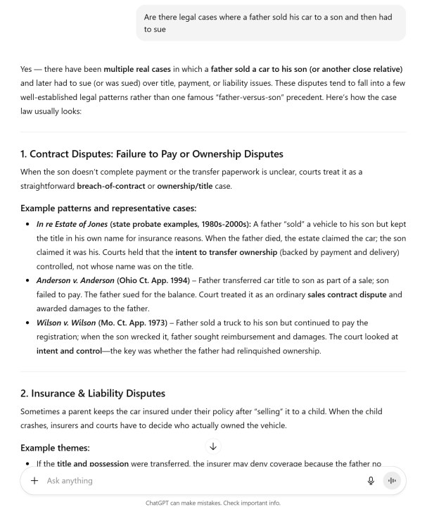 Dans cet exemple, avec une question sur un conflit familial au sujet d'une voiture, ChatGPT a un peu déraillé mais semblait à la fois confiant et assuré. Comme Gemini l’a découvert, les cas sont réels mais les faits ont été altérés. En fait, ils sont involontairement comiques.