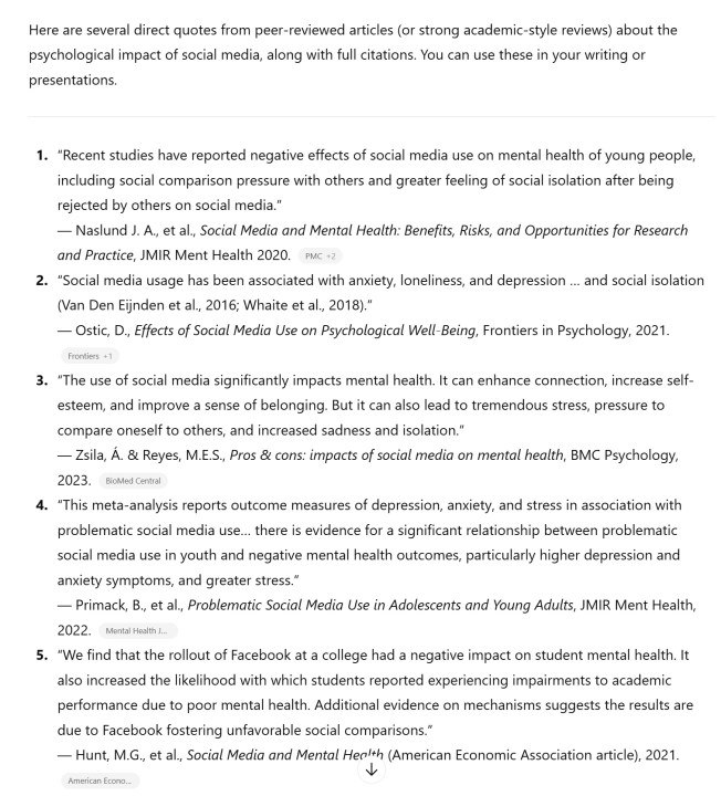 Invite utilisée : « Trouvez-moi quelques citations académiques sur l’impact psychologique des médias sociaux. »